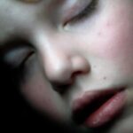 Child sleeping on a scarlet linen